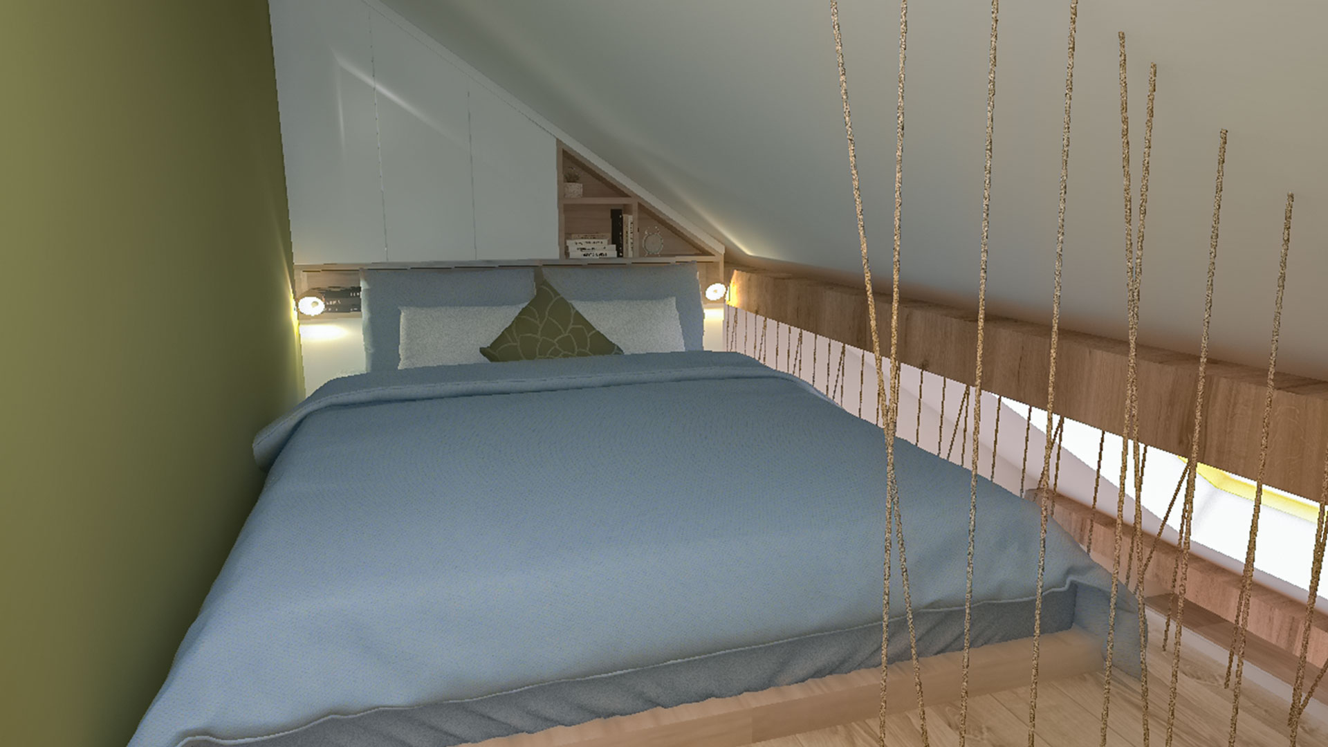 Pour l’espace séjour/nuit, la mezzanine vient libérer de l’espace au sol et peut accueillir un grand lit.