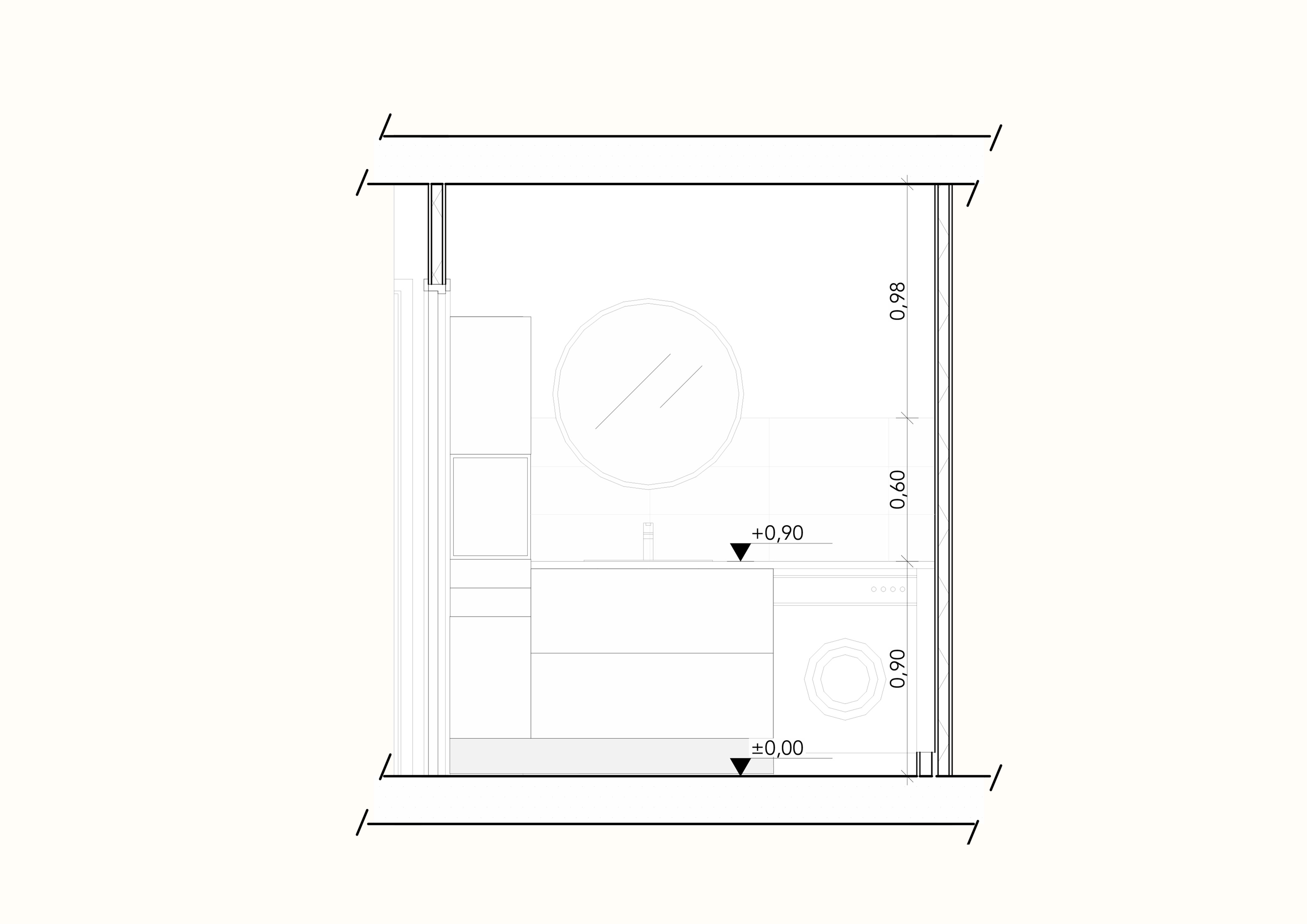 Pour laisser passer les évacuations et puisqu’un décaissement n’est pas réalisable, la douche est obligatoirement surélevée. Pour limiter la hauteur de la marche, un receveur extra-plat est posé sur pieds.